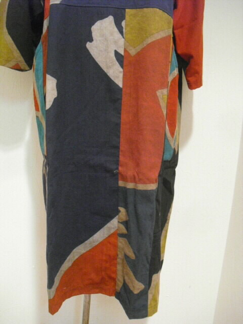 (後側) 裏無しになっていますが生地がしっかりしていますので 暖かい季節は中に半袖Tシャツ1枚で、 肌寒い季節は中に長袖のTシャツや薄手のセーターを着て 長い期間着ていただけるワンピースです
