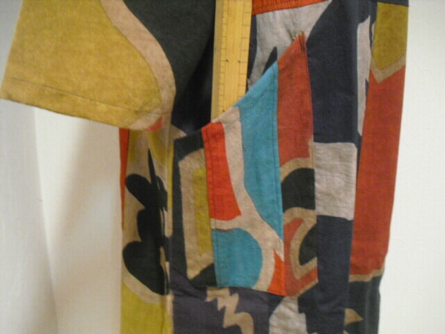 両脇には、パッチポケットを付けています。 違う色合いの生地を縦に3カ所切り替えて作っています。