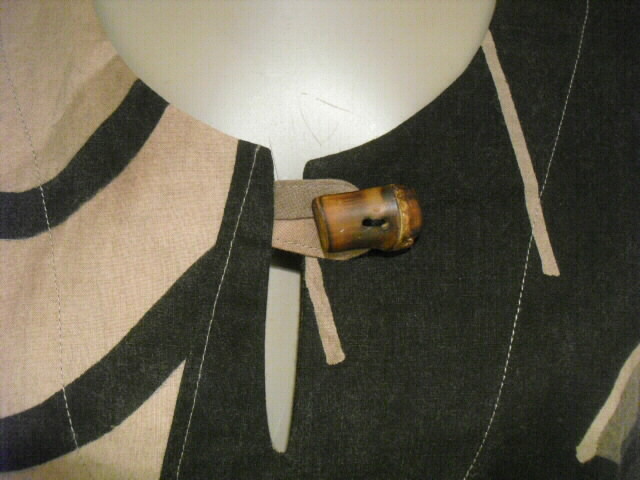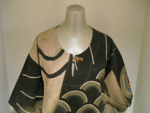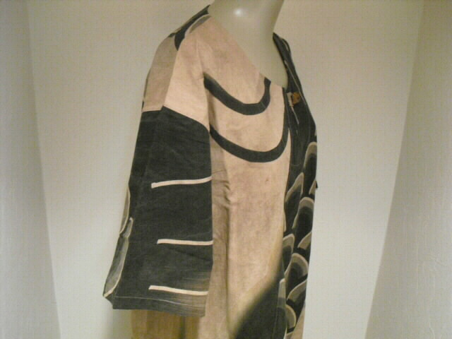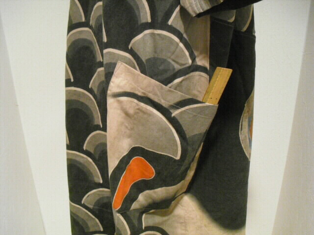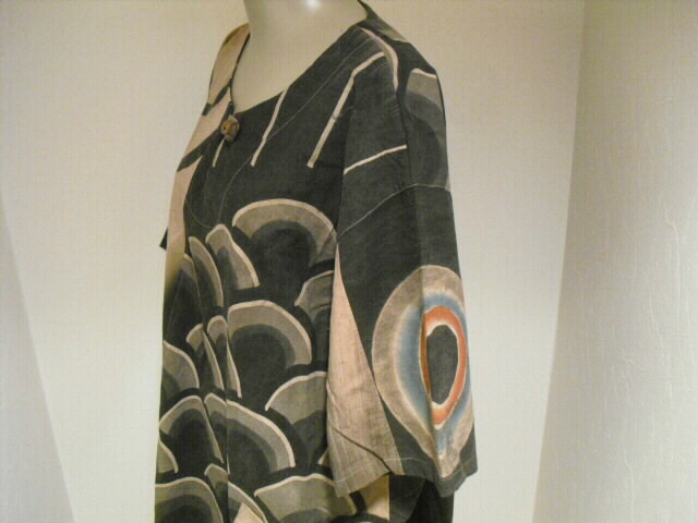 この作品は鯉のぼりの柄を生かした独創的なデザイン、柿渋・墨染めで素敵な色合いのお洋服に仕立て上がりました。