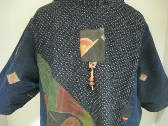 後は両脇に藍染めを縦に入れて背中から斜めに切り替えています。 上に書生絣。下に武者のぼり。 上の書生絣にはアクセントに武者のぼりをパッチしました。 ループ紐には赤いウッドビーズとソロバン玉が付いています。