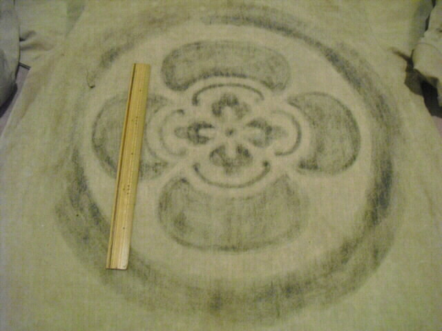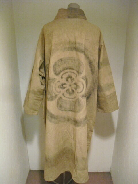 武者絵幟の派手さがなくなり、柿渋の色合いだけが出ました。 一見して幟旗とは分かりませんが、うっすらと見える武者の顔と後の家紋が、このお洋服のポイントです。