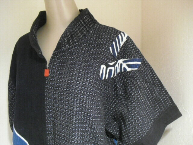 藍色の綿生地に描かれた白い図柄が、とても素敵なアクセントになっています。 筒描きは昔からある染め方なのですが、手間がかかるという事で今では少なくなりました。 古布の油単は年々数が少なくなりとても高価です。 ポイントは油単独特の大柄の家紋。 前身頃の真中で切り替えて左身頃に配置しています。 右身頃は書生絣です。アクセントに型染めを肩と裾にパッチしました。