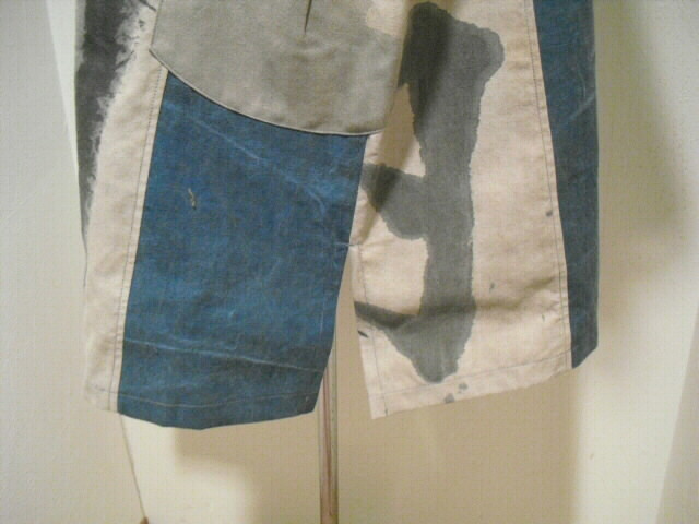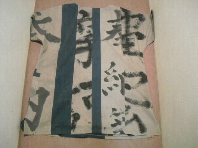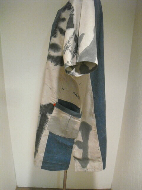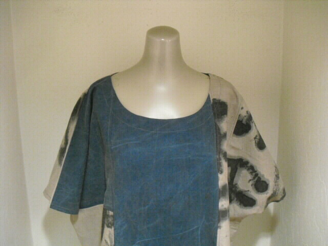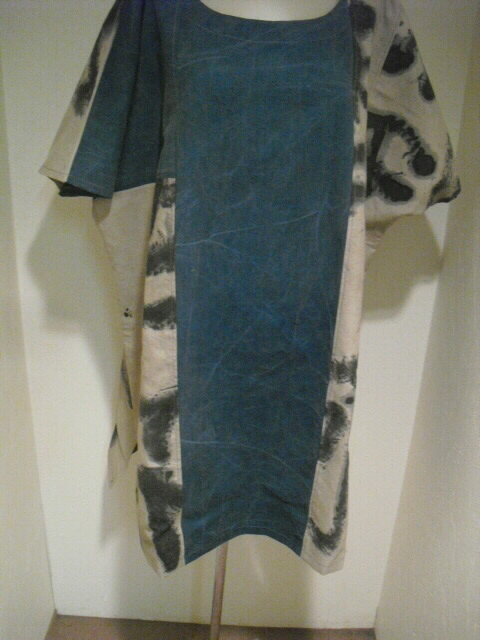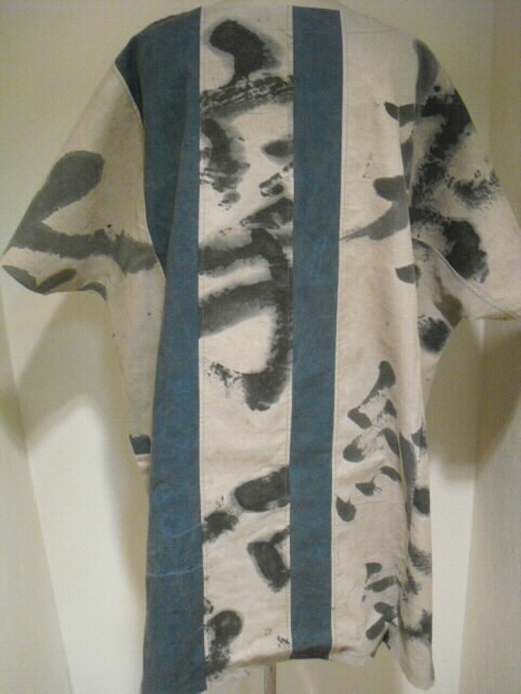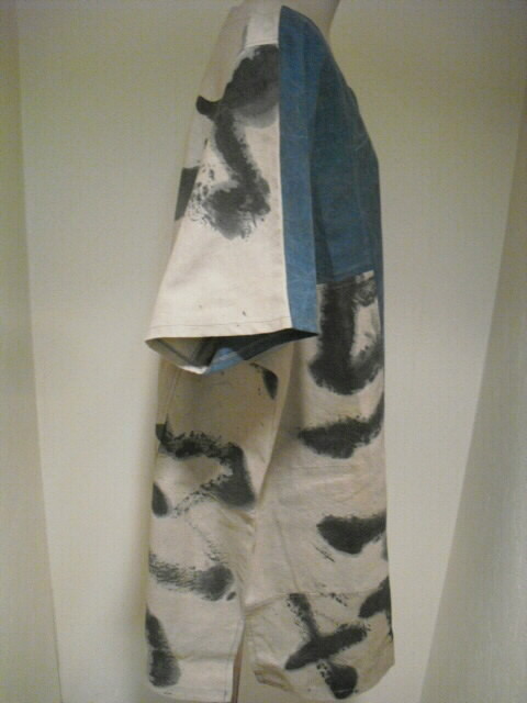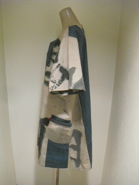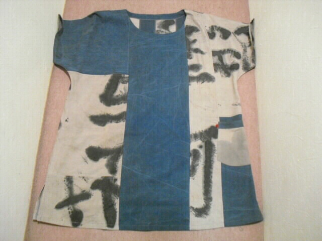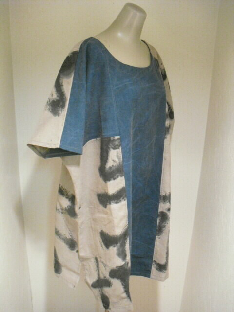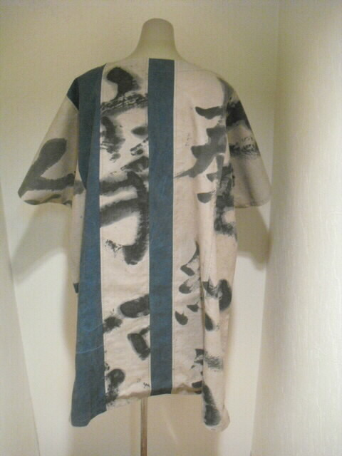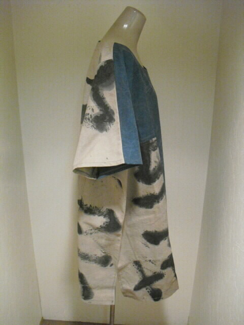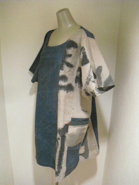 藍染め木綿の古布幕を柿渋で染色した生地。 古布の無地の木綿に墨で文字を手描きして柿渋墨染めした生地。 この2種類の組み合わせて作ったオシャレなチュニックです。