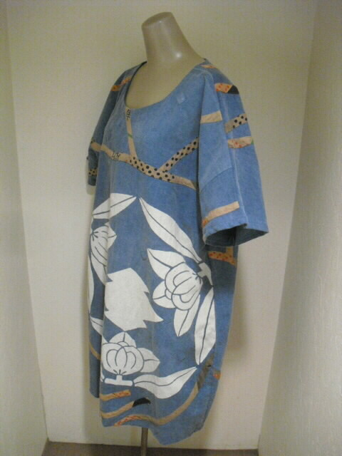 裏無しになっていますが生地がしっかりしていますので暖かい季節は中に半袖Tシャツ1枚で、肌寒い季節は中に長袖のTシャツや薄手のセーターを着て長い期間着ていただけるチュニックです。 このチュニックを作るのに使用したのは古布の家紋幕で数箇所に小傷がありました。 芯を貼ったり、同色の生地を縫い合わせたりして目立たなく補強しています。