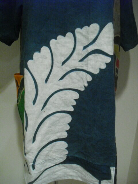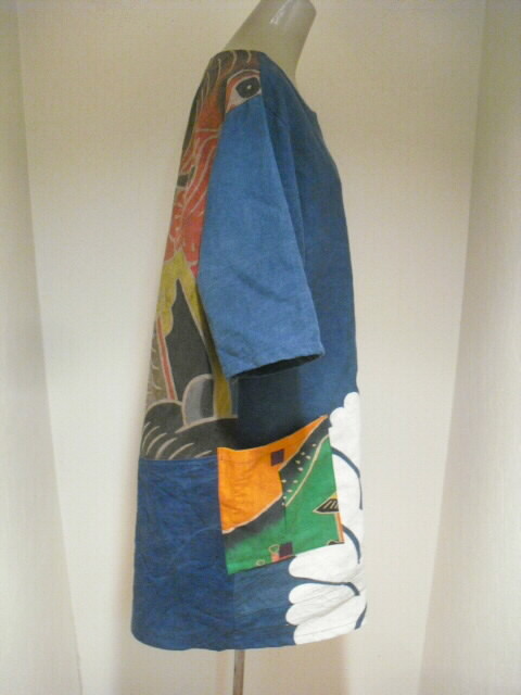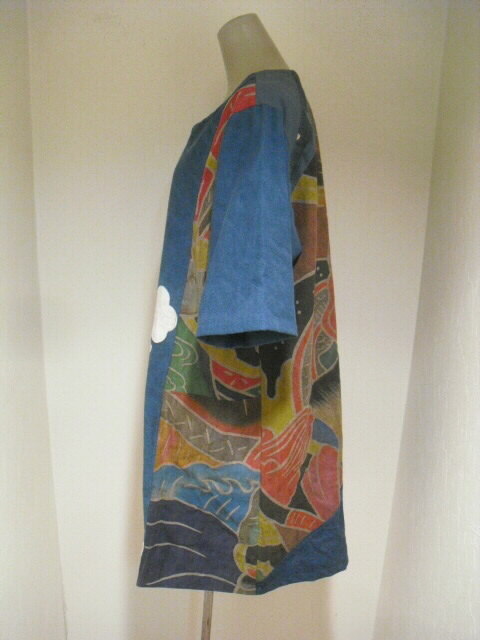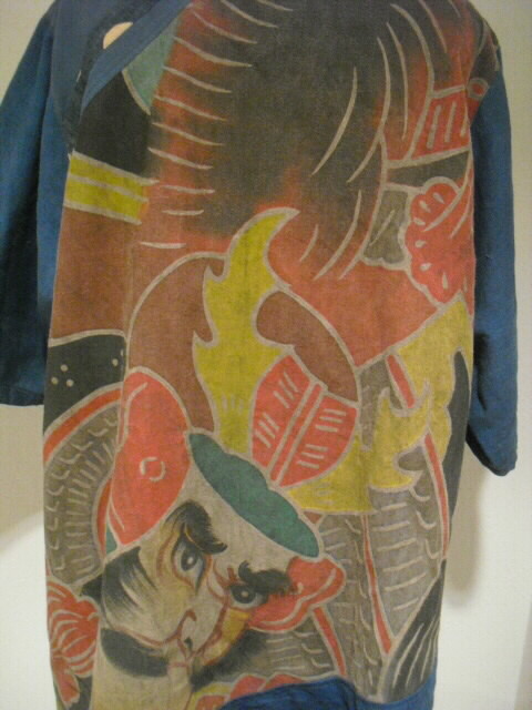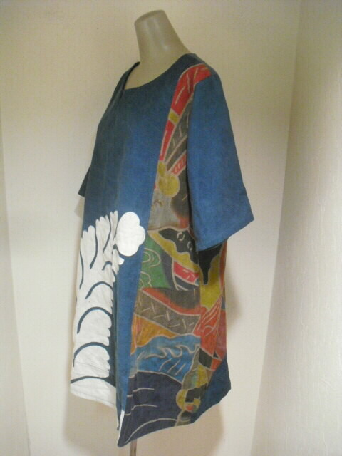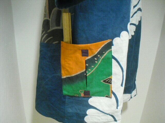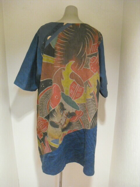 柿渋の中にある「柿タンニン」には 消臭・防腐・抗菌の効果があります。 着込むほどに柿渋の風合いが増していく素敵なお洋服です。 前は古布幕を配置。左身頃に武者のぼりを使っています。 正面の白地の絵柄は上下が反対になっていますが、大きな下り藤の家紋になります。