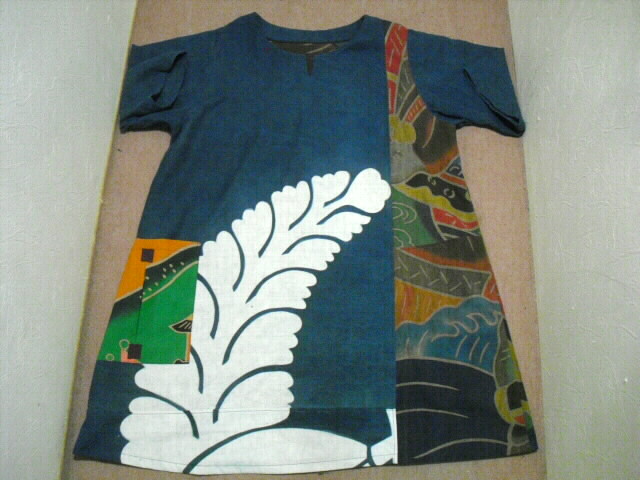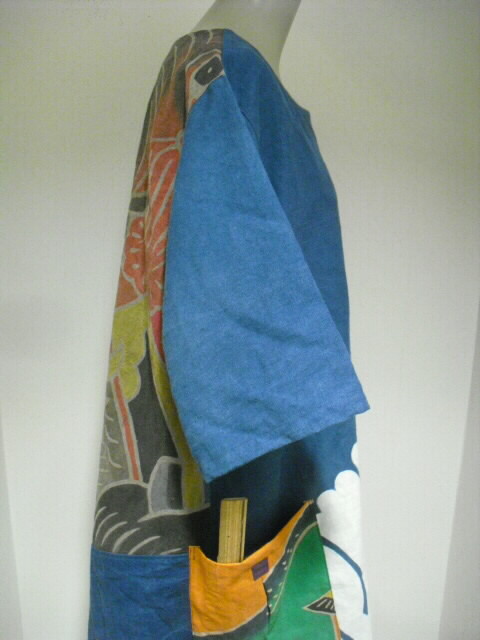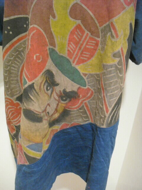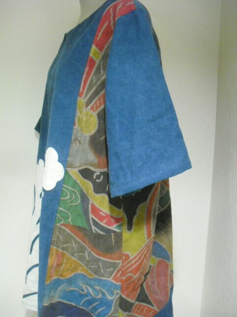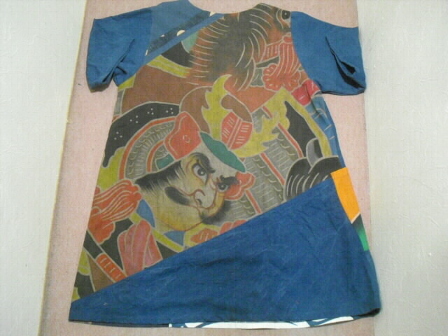 後は左肩に風呂敷の生地を入れ武者のぼりのを斜めに裁断して顔の部分を大胆に配置しました。