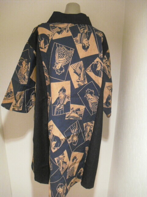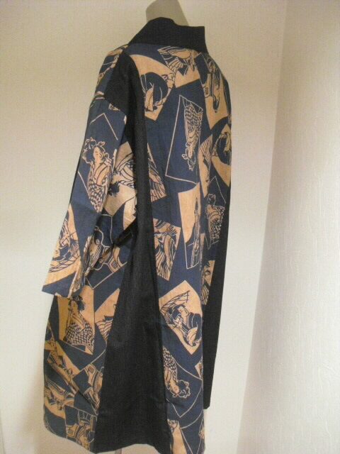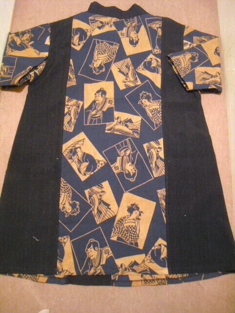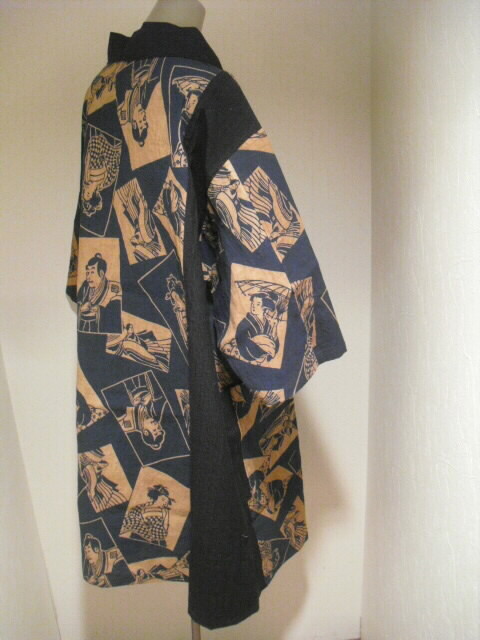 前は柿渋染めした浴衣を使い、アクセントに左肩から裾へ幅19cmで縞木綿を入れました。