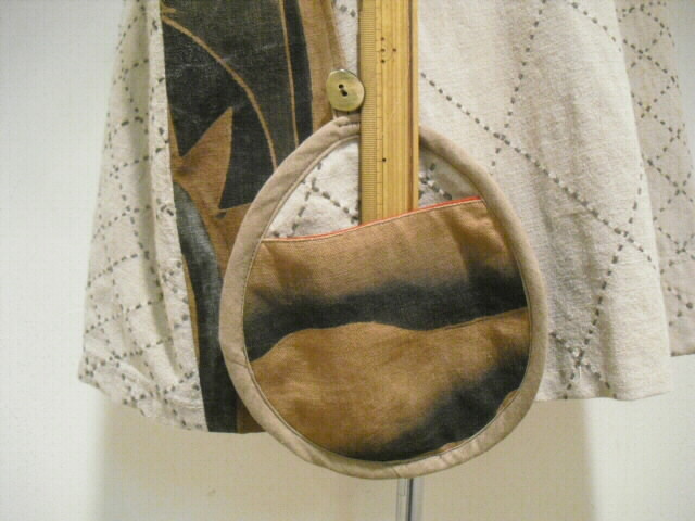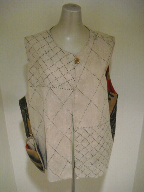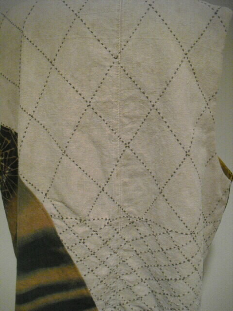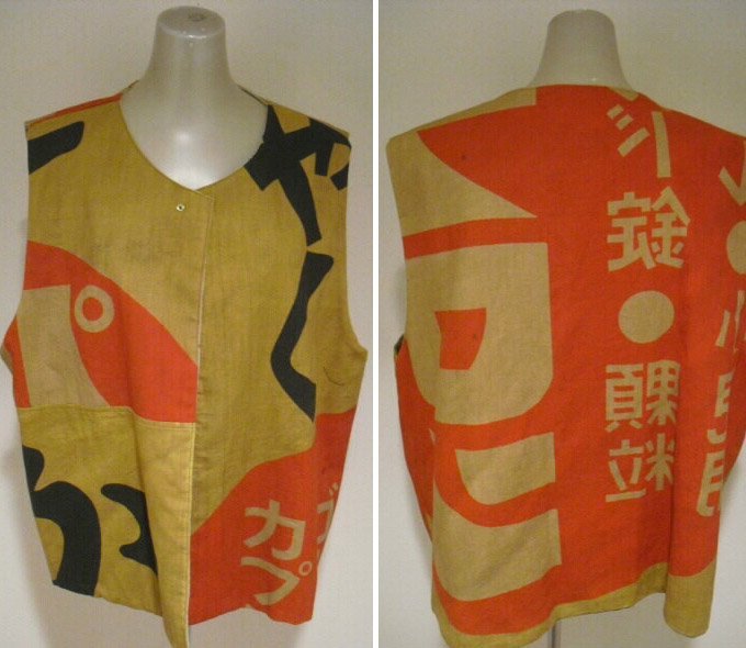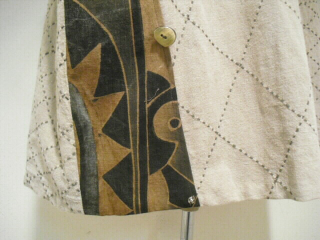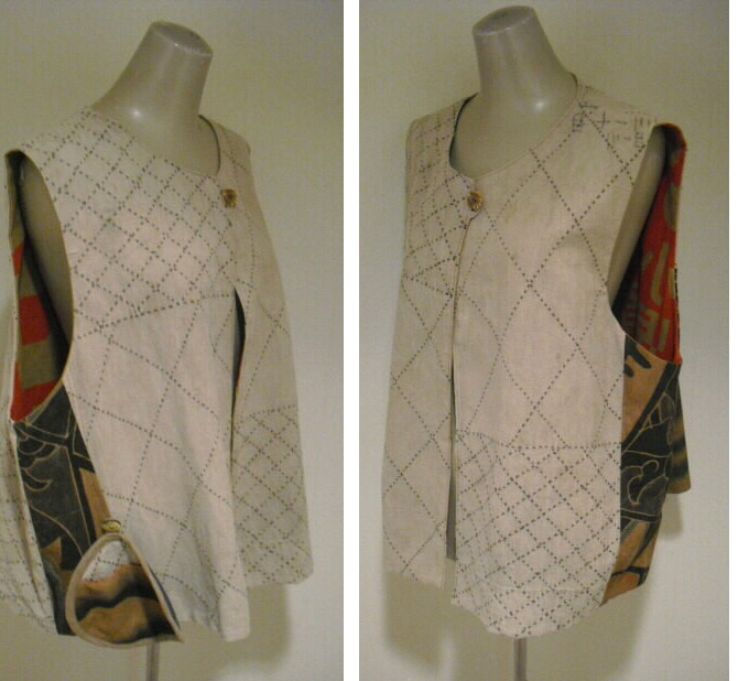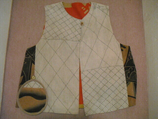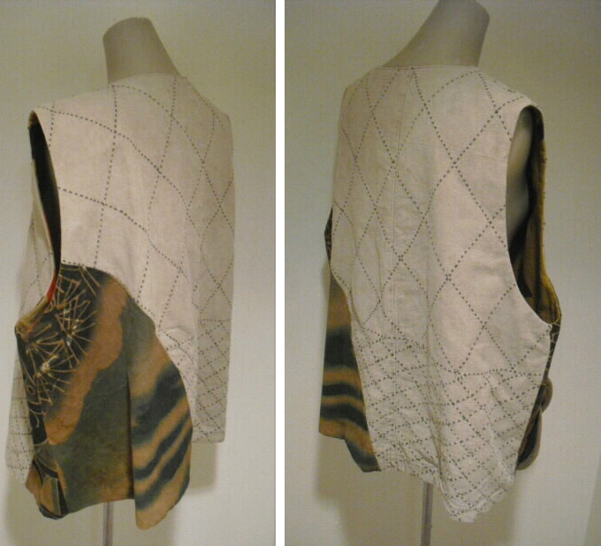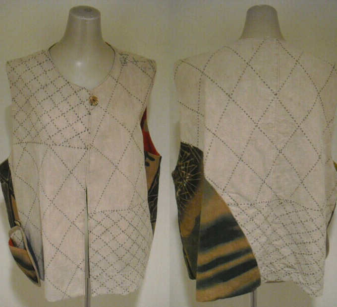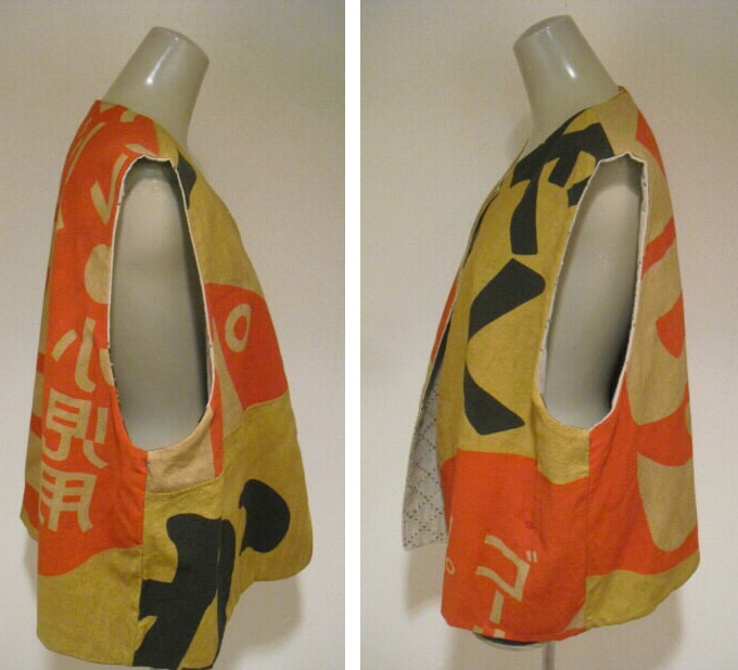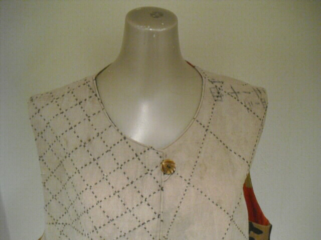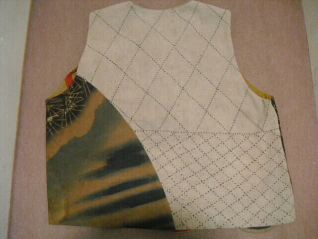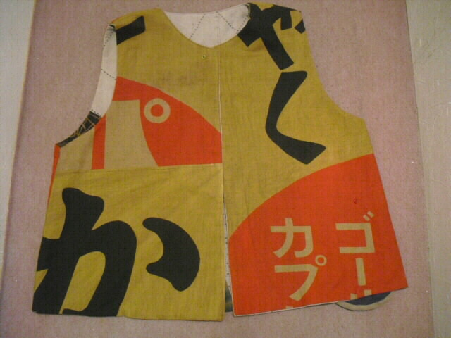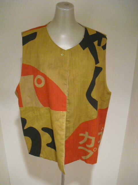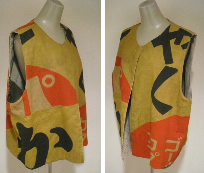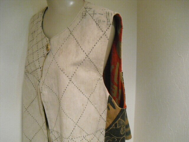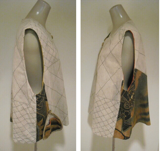 ![]() お洒落なリバーシブルベストです。 ![]() 一着で二着分楽しめます♪ ![]() 綿素材ですのでお手入れも簡単です。 生地は厚手でしっかりしていますが腰が折れた柔らかい手触りです。 ![]() 片面は柿渋鉄媒染した剣道着と武者絵幟(のぼり)で作りました。 ![]() 剣道着をべースにして両脇に武者絵幟を入れています。 ![]() 刺し子が素敵なデザインになっています。 ![]() 前開きで直径1.8cmのループボタンが1個付いています。 ![]() ボタンは水牛の角です。 ![]() ポケットは右脇にあります。 縦18cm、横16.5cm の円形の土台布に深さ14cmのポケットが付いています。 ![]() ポケットの土台は上のループ紐とボタン、下の裏にあるスナップボタンで留めています。 取り外しができます。 ![]() 袖口は大きく開けていますので肩や腕の動きも楽で、インナーに厚手のものや 重ね着をしても無理がありません。大変に便利で着まわしのきくベストです。 ![]() ![]() ![]() 裏は懐かしいパブロンの広告のぼりです。 ![]() こちらも色合いの派手さを抑えるために柿渋で染色しています。 ![]() 周りの視線を惹きつけること間違いなし♪です。 ![]() 両面でまったく雰囲気の違うベストとなります。 ![]() どちらを着るか迷いそう♪おしゃれも2倍楽しめます。