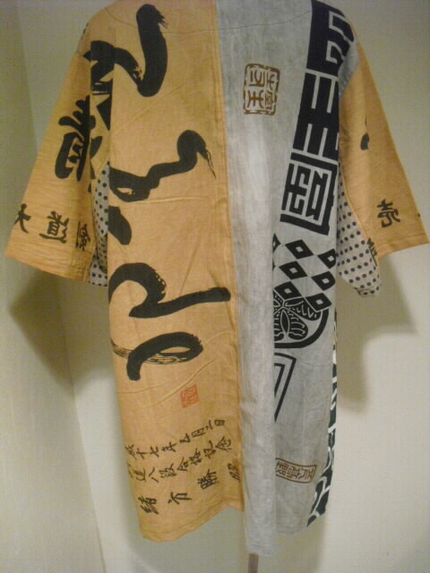 左脇と両袖の後の「豆しぼり」と後のグレーの手ぬぐいは鉄媒染したものです。