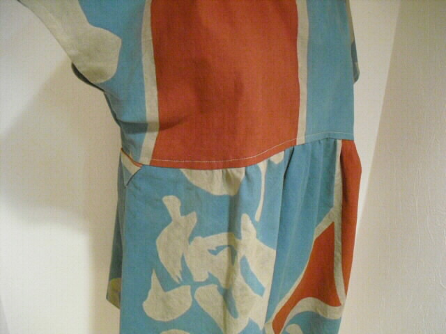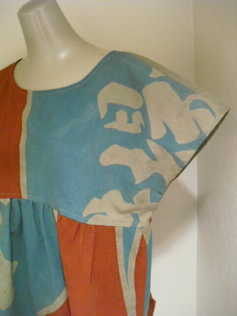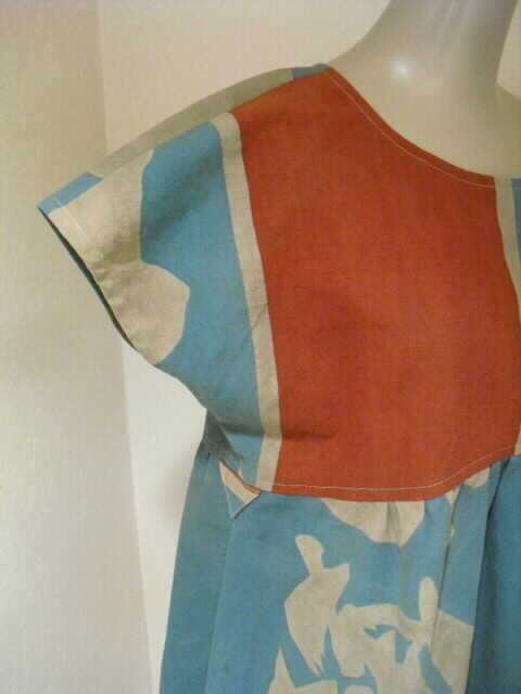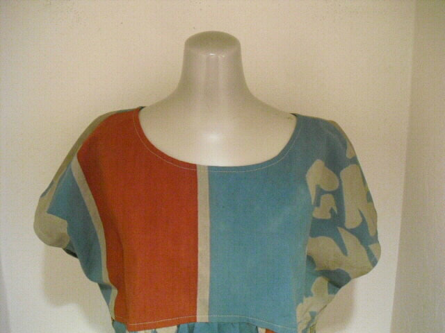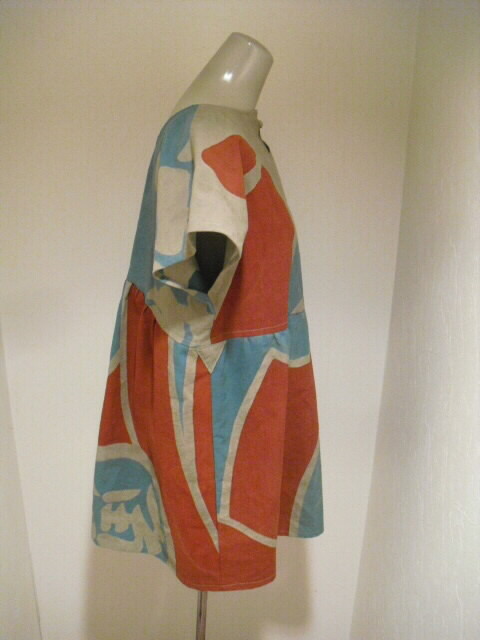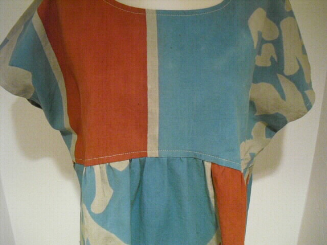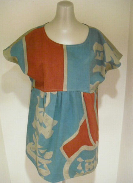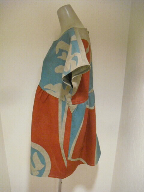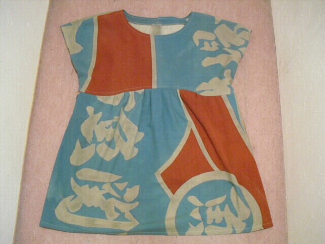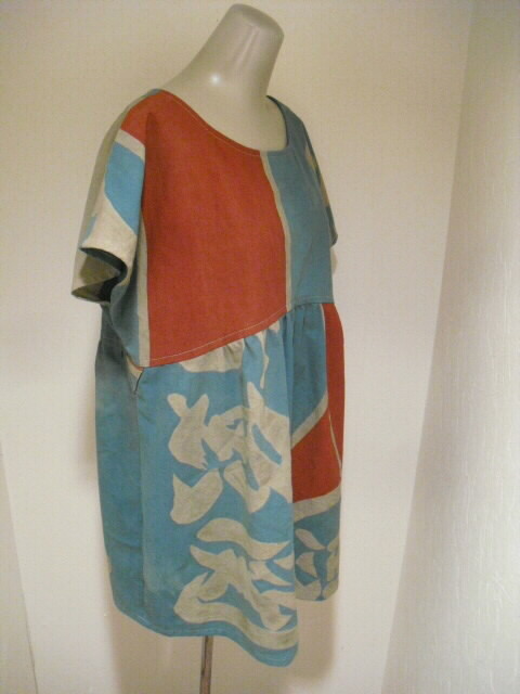 大漁旗で作ったチュニックです。 色合いの派手さを抑えるために柿渋で染色しています。