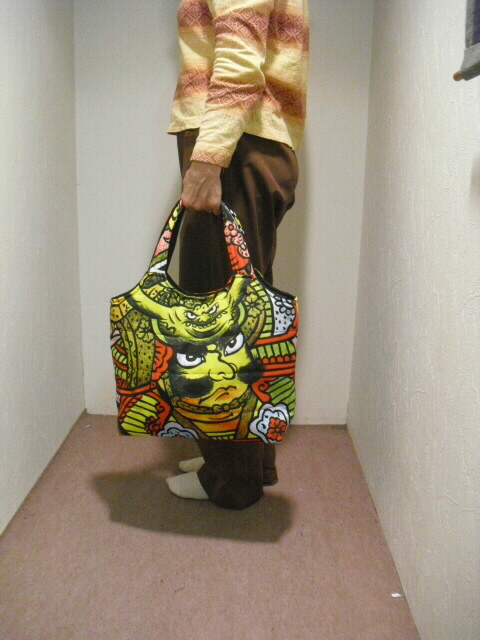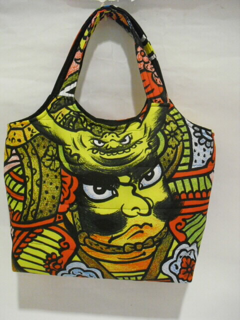 古布の武者絵幟で作った手提げバッグです。最近の幟旗で素材は化繊(ナイロン)です。水に強く、重さ140gと大変軽いバッグに仕上がりました♪キルト芯をはさんでフリーステッチをかけています。ふわふわした柔らかい手触りです。表と裏は、違った絵柄になっていますので両面で違う表情も楽しめます。