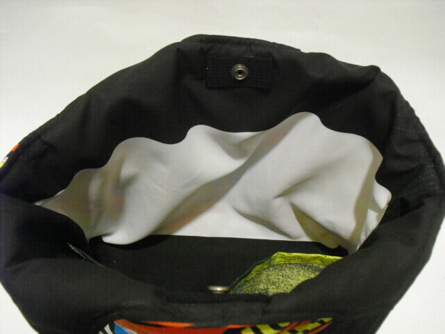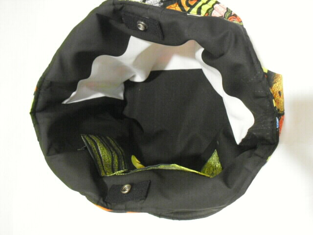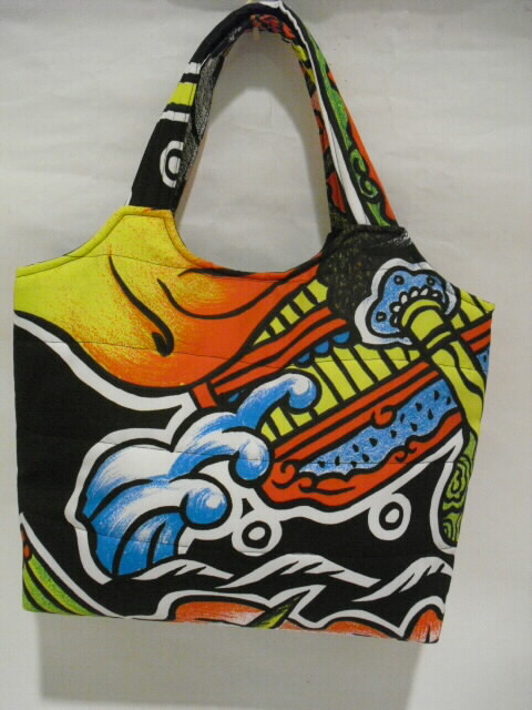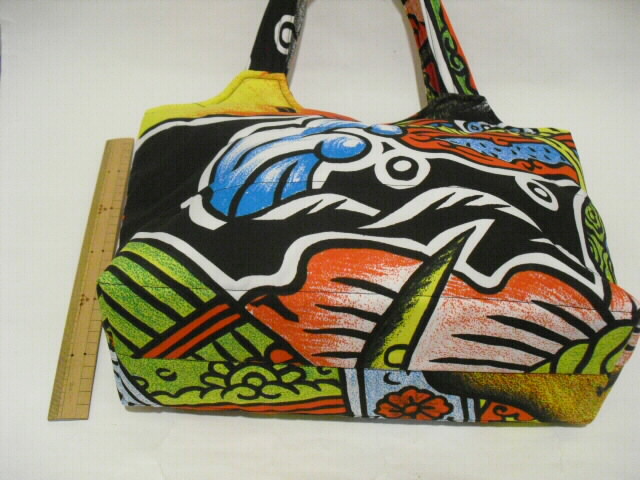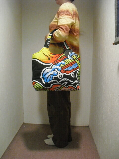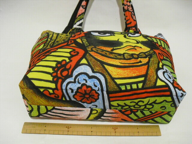 素材・・・ナイロン サイズ・・・幅 31cm×高さ 26cm×底幅 11cm持ち手・・・長さ 42cm特徴・・・古布の武者絵幟で作った手提げバッグです。最近の幟旗で素材は化繊(ナイロン)です。水に強く、重さ140gと大変軽いバッグに仕上がりました♪キルト芯をはさんでフリーステッチをかけています。ふわふわした柔らかい手触りです。表と裏は、違った絵柄になっていますので両面で違う表情も楽しめます。開け口はボタンで留めるタイプです。中には深さ11cmのポケットが2箇所。(口幅×13cmと9cm)底板が付いています。重い物を入れてもバッグの型崩れを防いでくれます。ちょっとしたお出かけやご旅行時のサブバックに・・・周りの視線を惹きつける♪お洒落な手づくり一点モノのバックです。価格 6,300円