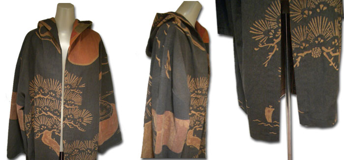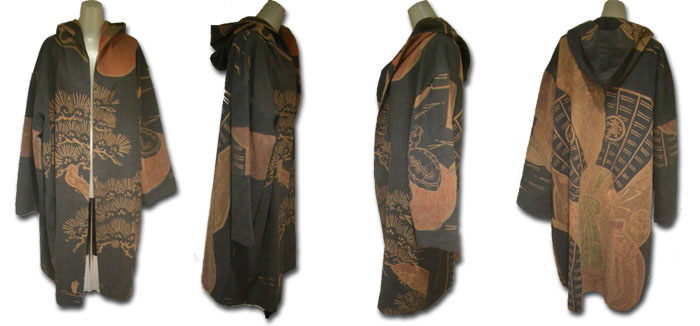 「幟(のぼり)旗」を 天然染料の柿渋で染めてフード付ロングコートへリメイクしました。