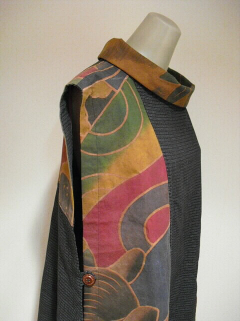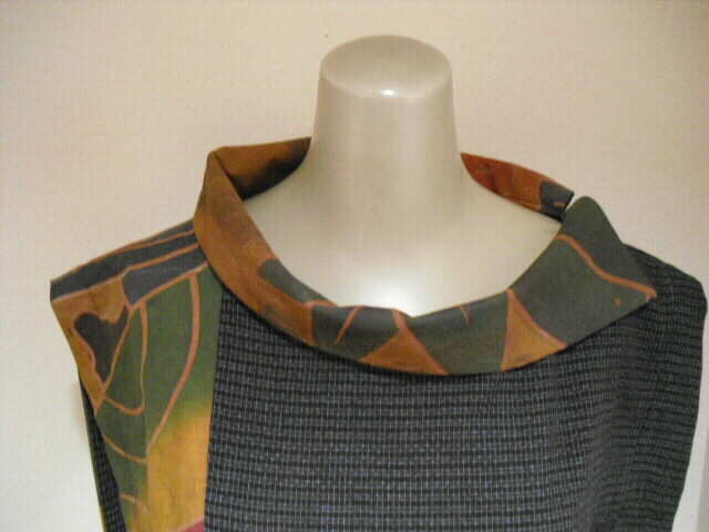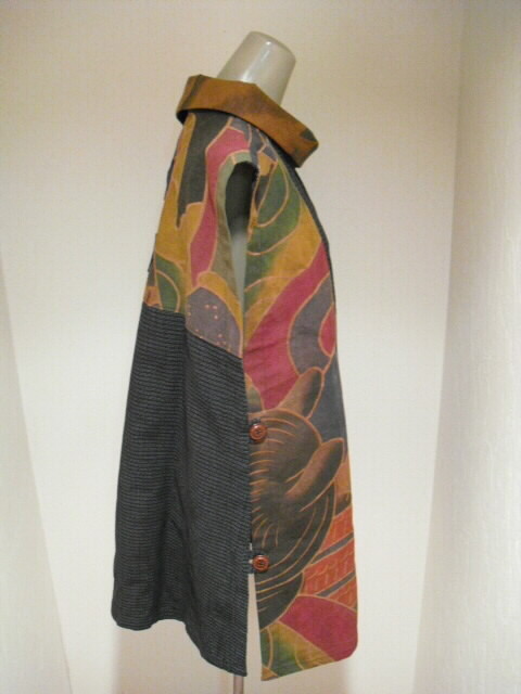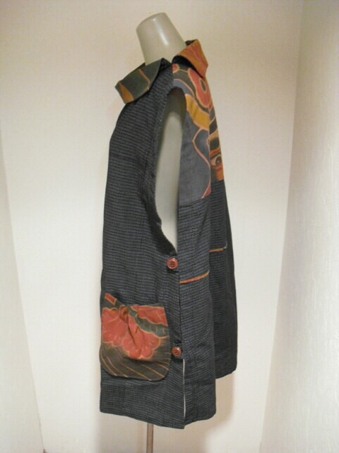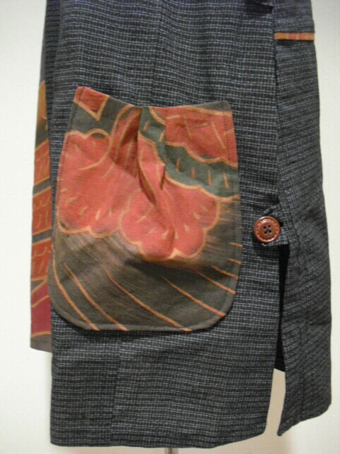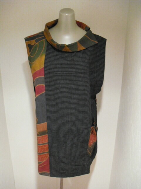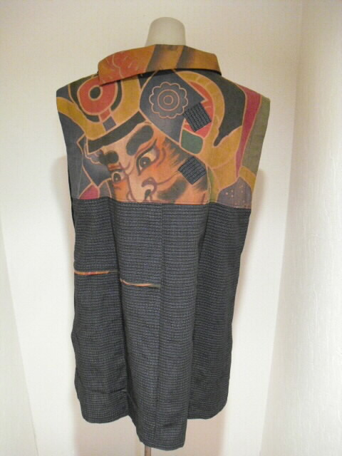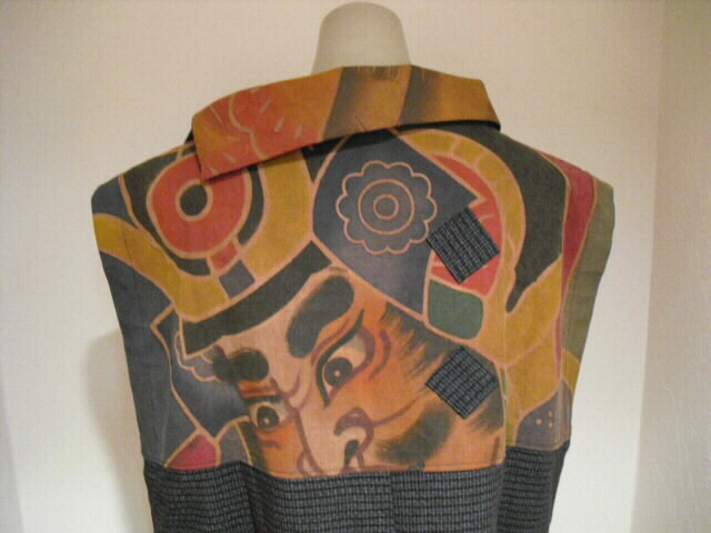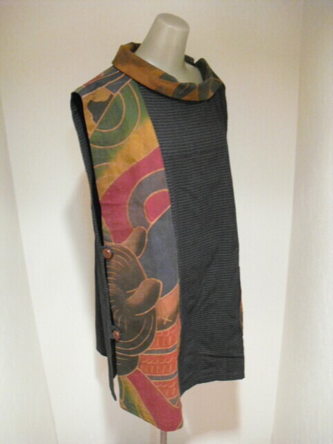 古布の「武者絵幟」と縞柄の綿の着物を組合わせて作った個性輝くチュニックです♪