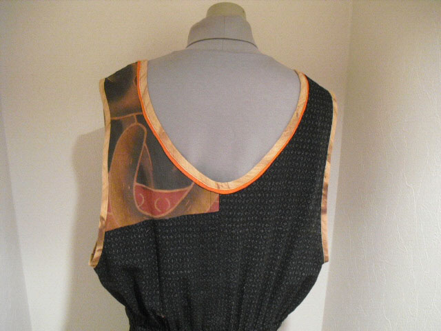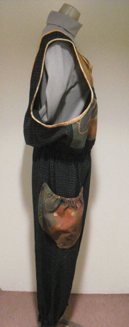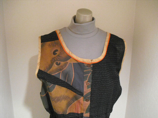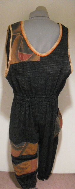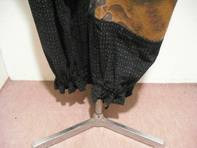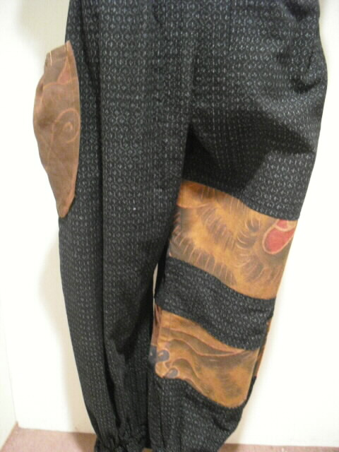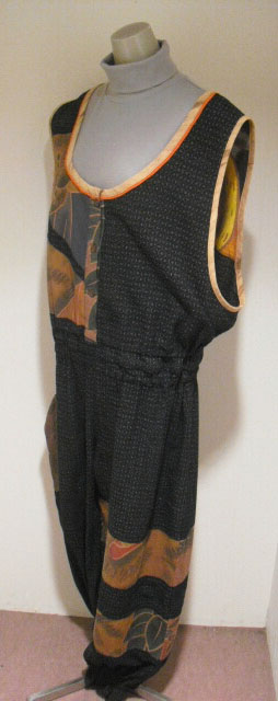 絣(かすり)と古布の「武者絵幟(のぼり)」を組合わせて作ったジャンプスーツです。