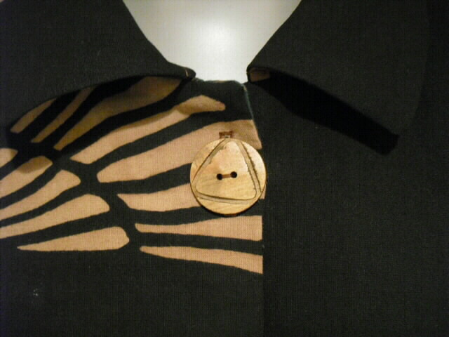 柿渋染めのこの洋服に合う、直径2.8cmの大きくてお洒落な木のボタンを選んでいます。