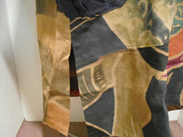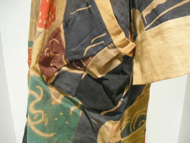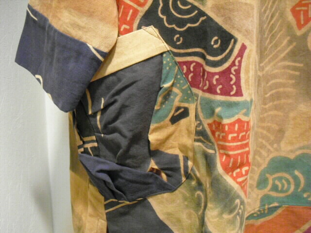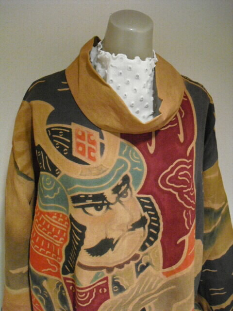 古布の「武者のぼり」は数も限られる為、大変高価なリメイク素材です。 胸囲120cm、裾幅160cmと、ゆったりサイズで気になるラインもカバーし楽な着心地です。