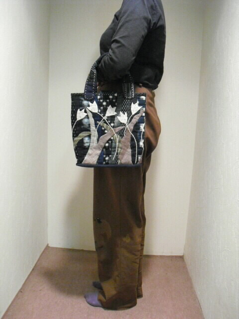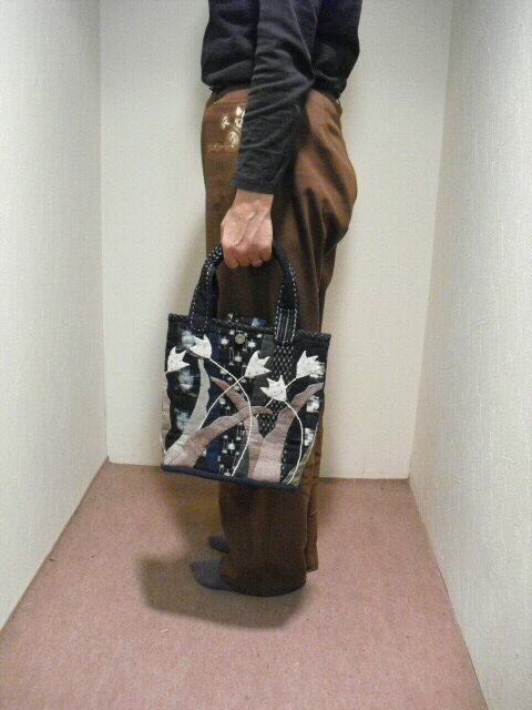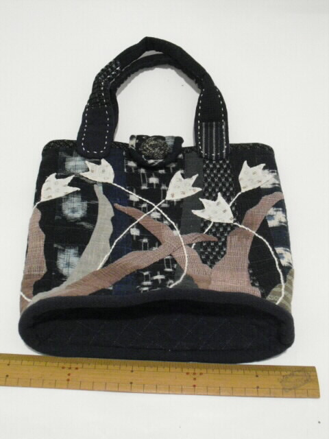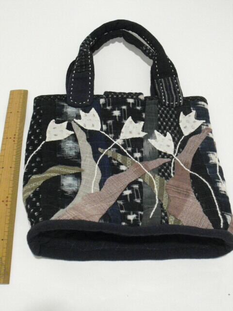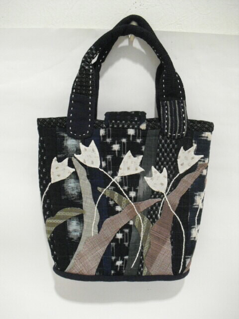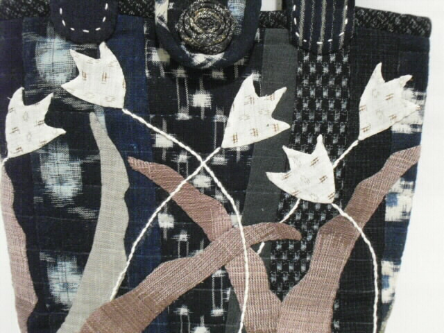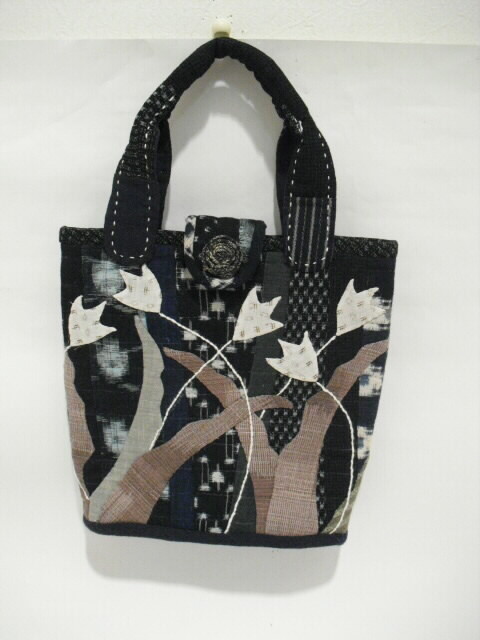 古布の絣と着物を使い、パッチワークと刺し子で時間をかけて作った手づくり一点モノの手さげバッグです。