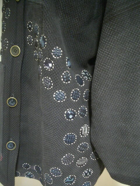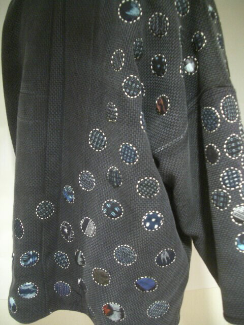 ポイントは150個を超える古布の絣のパッチと刺し子。