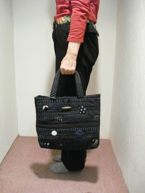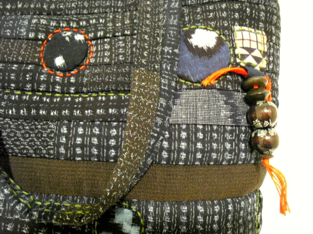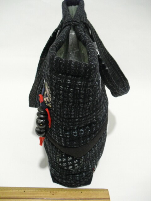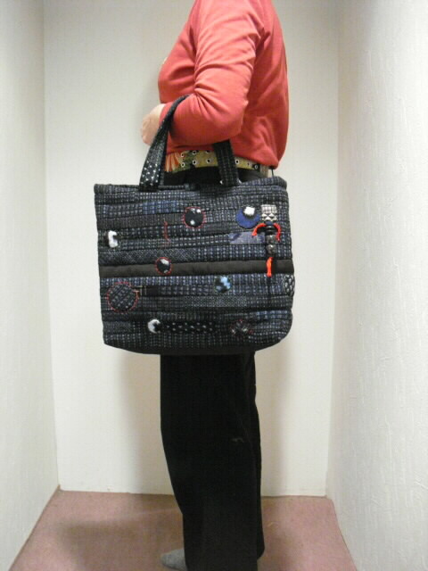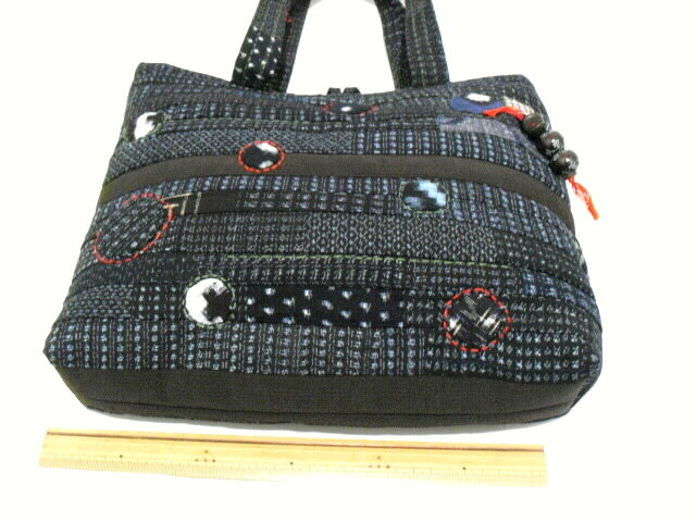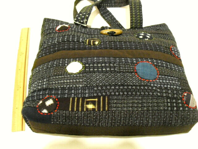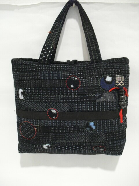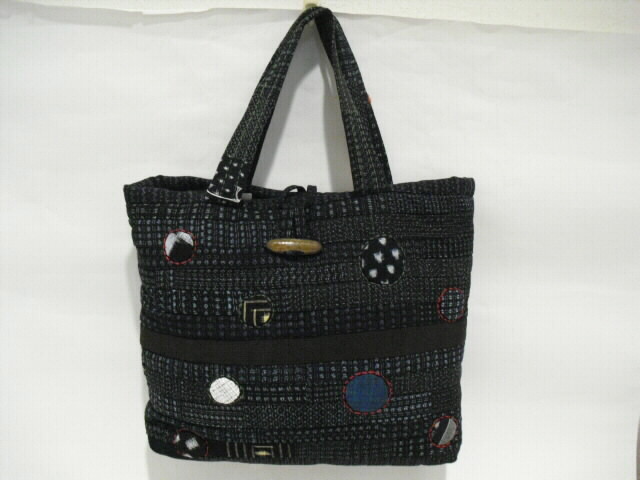 高価な古布の絣(かすり)と着物を使い、パッチワークと刺し子で 時間をかけて作った手づくり一点モノの手さげバッグです。