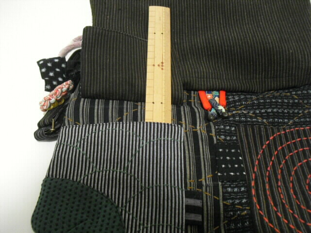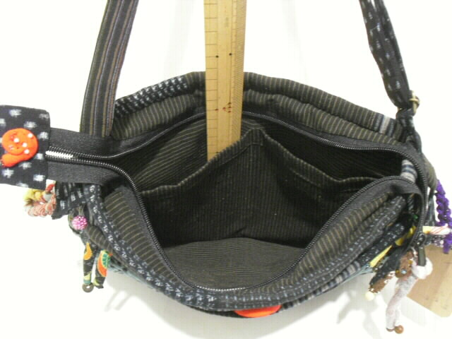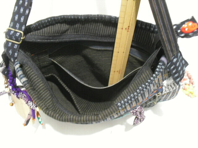 開け口はファスナー式。ファスナーの長さは39cmです。 中は縞柄の綿の着物で作っています。 中には18cmのファスナーポケットがあります。
