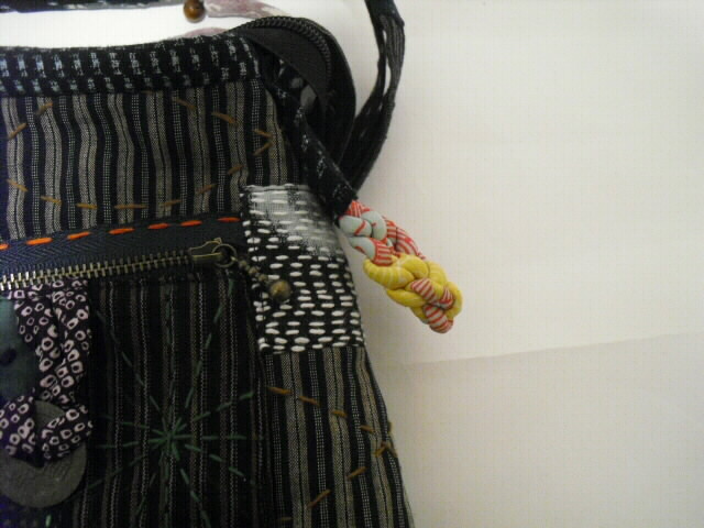 外側にはちりめんや絞りの着物から作った飾り紐、古銭、木札、飾り石など たくさんの装飾をしています。
