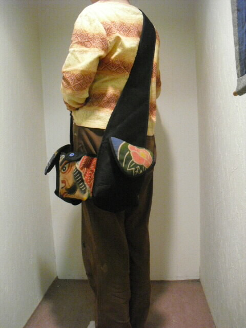 サイズ(三連ポケット部分) ・・・幅 約41cm×高さ 約23cm×底幅 約4.5cm 肩紐・・・長さ105cm、 幅 6cm〜16cm 丈(肩紐の頂点からバッグの底部まで)・・・80cm 特徴・・・ 黒の綿素材と柿渋染めした武者絵のぼりで作った、お洒落なバックです。 女性にも男性にも人気のショルダーバッグ。オリジナル商品で、一点物です。 綿素材で軽く、ふわふわした柔らかい手触りです。