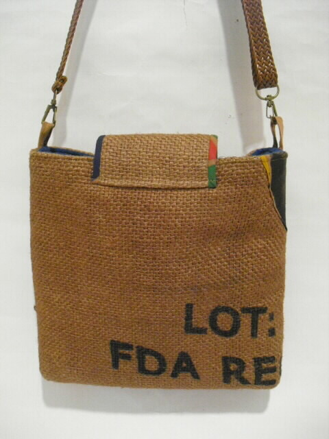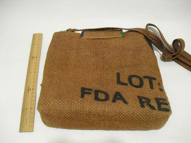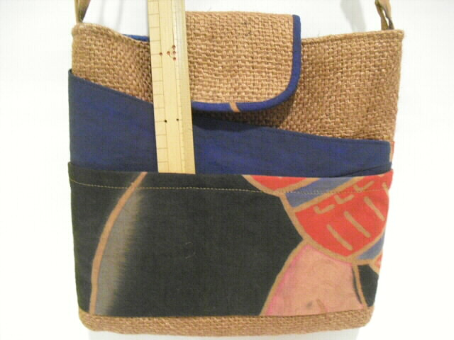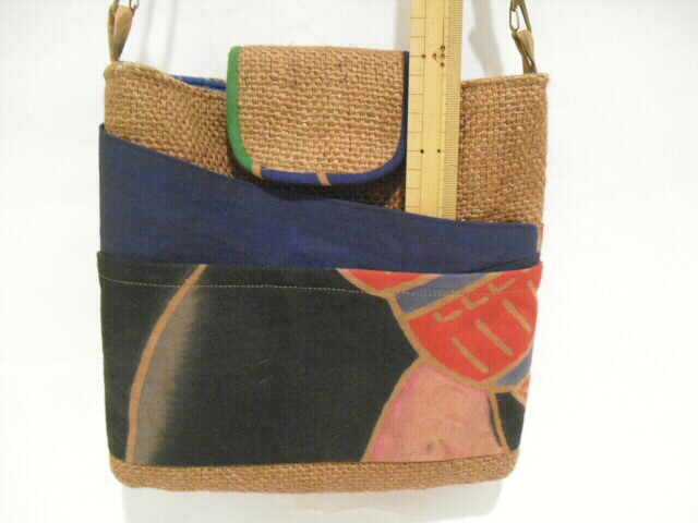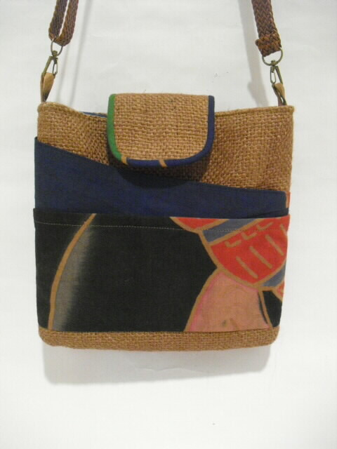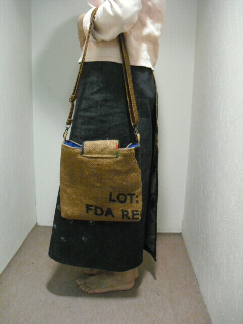 特徴・・・ 和と洋のコラボレーションバッグです。 英字が書かれた麻のコーヒー豆袋と綿の武者絵のぼりを組み合わせて作った ショルダーバッグです。 とても個性的でも面白く仕上がっています。 コーヒー豆袋も武者絵のぼりも柿渋で染色しています。