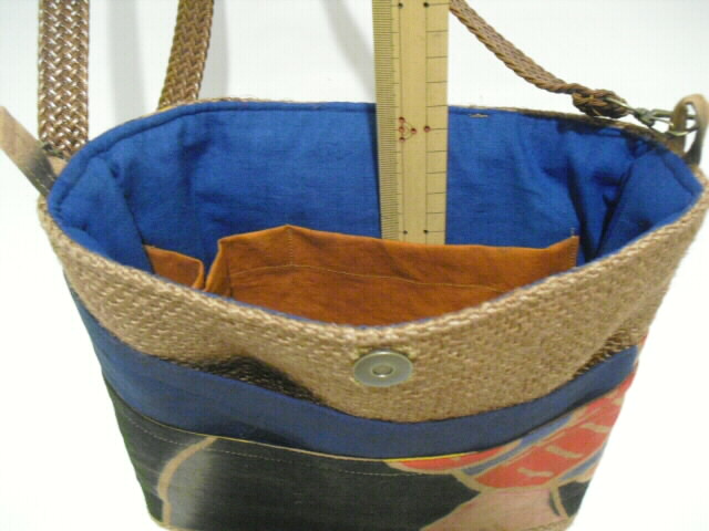 中の裏地も武者絵のぼりの生地で作りました 深さ15cmのポケットを2個付けています。 底板付きですので重いものを入れても型崩れを防ぎます。
