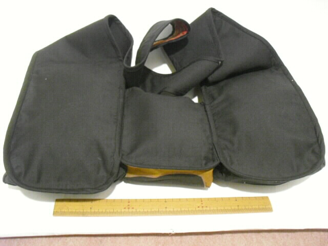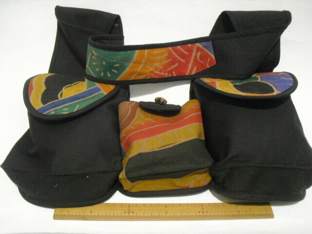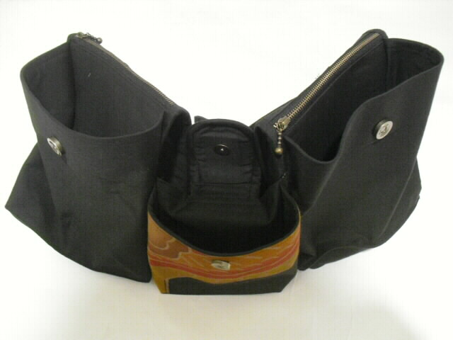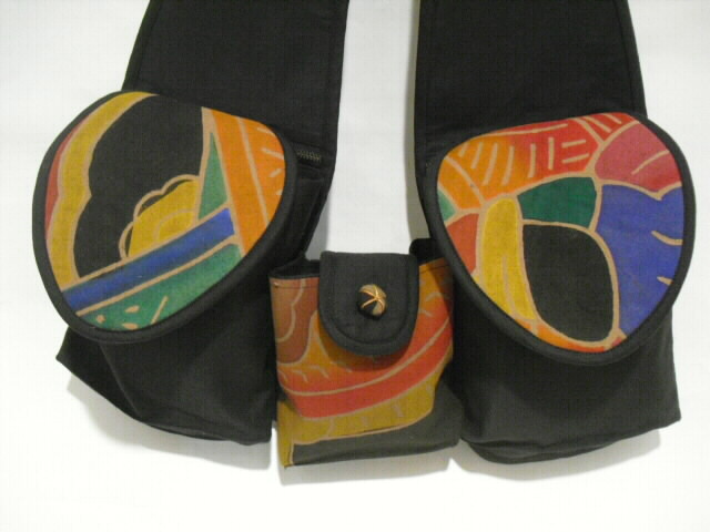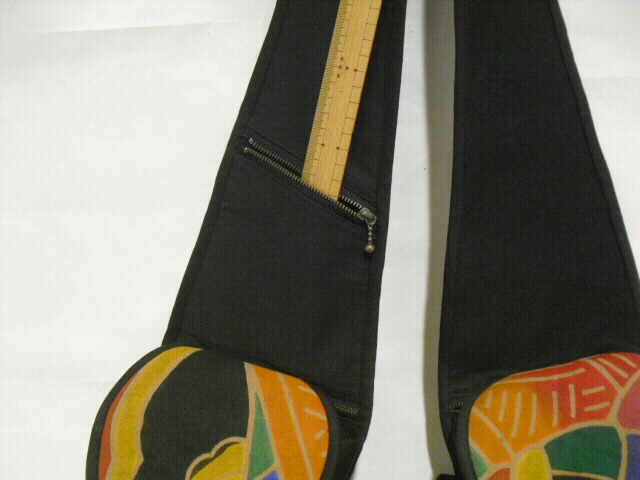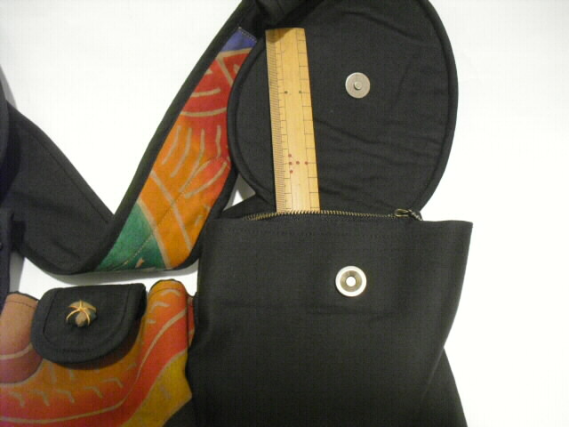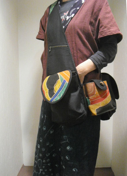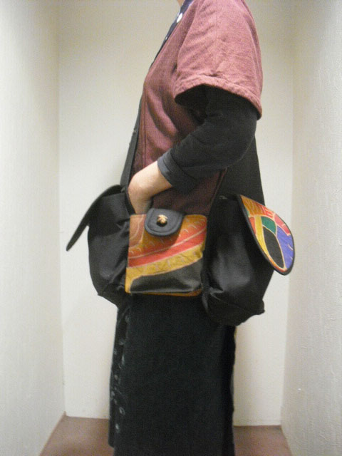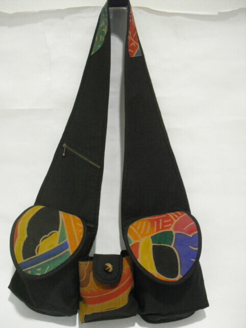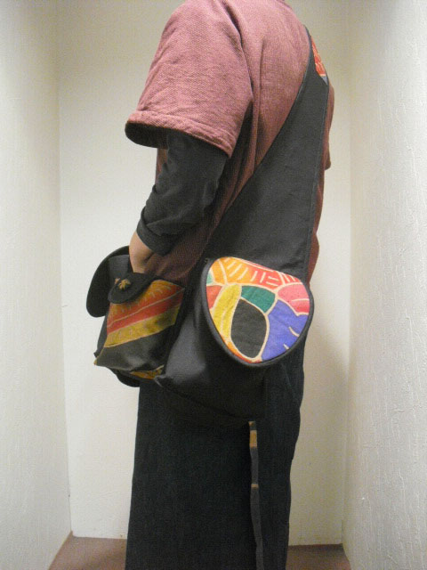 サイズ(三連ポケット部分) ・・・幅 約41cm×高さ 約23cm×底幅 約4.5cm 肩紐・・・長さ105cm、 幅 6cm〜16cm 丈(肩紐の頂点からバッグの底部まで)・・・80cm 特徴・・・ 黒の綿素材と柿渋染めした武者絵のぼりで作った、お洒落なバックです。 女性にも男性にも人気のショルダーバッグ。 綿素材で軽く、ふわふわした柔らかい手触りです。