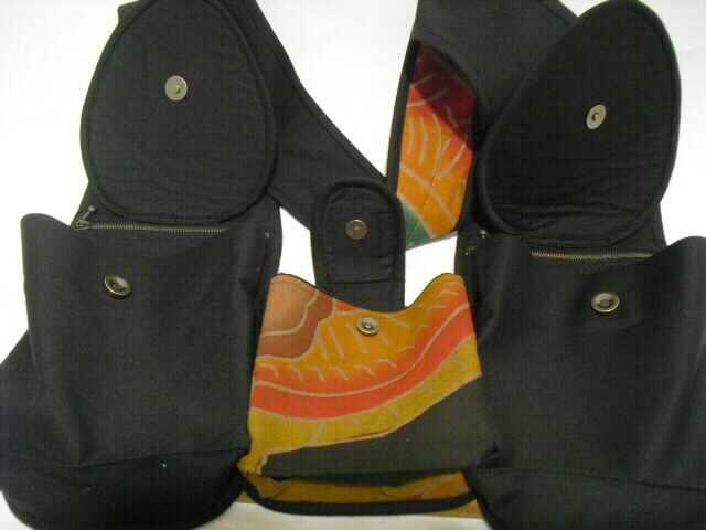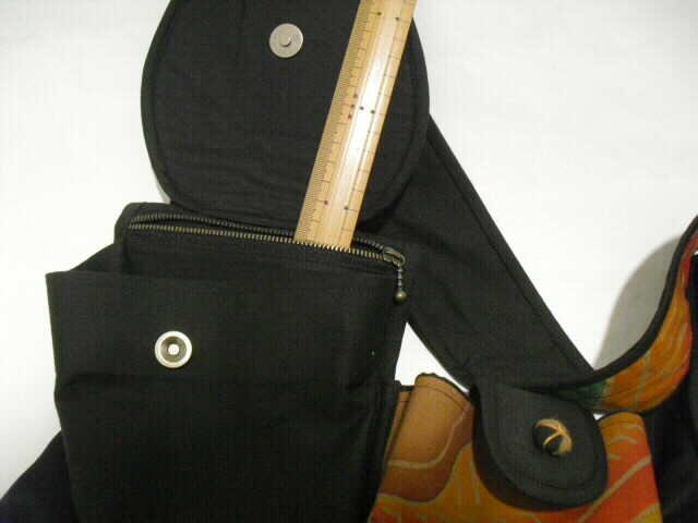 左右のポケットの中にもファスナー式ポケットを付けています。 バッグのストラップの前面にはファスナー式ポケットを付けています。 このポケットも重宝しそうです。 周りの視線を惹きつける♪個性輝く、素敵な手づくり一点モノのバックです。 価格 14,800円