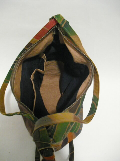 裏・・綿、ポケット2個・底板はありません。特徴・・・柿渋染めしたのぼり旗で作ったお洒落で素敵なバッグです。このバッグは手提げバッグ・ショルダーバッグ・リュックサックの3つの使い方ができる3WAYバッグです。その日の荷物や気分に応じて、使い方を変えてください。本体のサイドにもファスナーがついていて開閉可能ですので、荷物の取り出しが便利です。ポケットは表のサイドに1個(深さ10cm×幅10cm)、中に2個(深さ12cm×幅9cm、深さ12cm×幅7cm)付いています。柿渋染めは生地を丈夫にし使い込むごとに色目を増すのが最大の特徴です。ご自分だけの味わいの色に育てあげてください。ちょっとしたお出かけに・・・周りの視線を惹きつける♪お洒落な手づくり一点モノのバックです。価格 14,500円