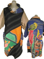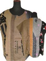 たくさんの古布を贅沢に使ったチュニックです。書生絣、型染め、縦縞着物生地を組み合わせました。前は真中に型染め、右に絣、左に縦縞の着物生地と絣を組み合わせています。