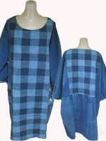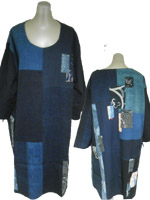 藍染無地に武者のぼりをパッチワークして組み合わせて仕立てたチュニックです。前は濃い目の色の藍染を真中に置いて左右に色合いの違う藍染を組み合わせています。後は数種類の藍染と色柄の違うのぼり旗の生地をランダムにパッチワーク。