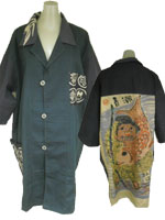前後、左右で切り替えしに使う布を変えていますので見る方向で違った雰囲気を楽しめます。 左身頃に配置した上が橙と下が緑色の風呂敷がとても素敵なアクセントになっています。