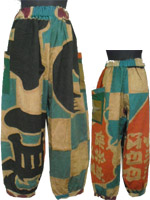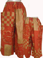 大漁旗と風呂敷を組み合わせて作ったパンツです。 前後、どちらが前でも着ていただけます。 生地は柿渋染めして鉄媒染しています。サルエルパンツです。