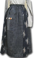 古布の絣の着物を解いてお作りしました。着心地のよいパンツです。ウエストは総ゴムで92cmまで伸びます。ゆったりと楽なはき心地です。裾にはゴムは入っていません。ストレートタイプです。右脇には深さ19cm×幅17.5cmのポケットを付けています。ちょっとした小物を入れるのに重宝しそうなポケットです。