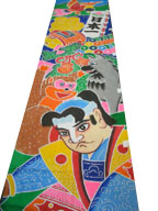 節句旗は縁起物の絵柄の他にも昔話のヒーローも登場します。金太郎は絵画に描かれる際は普通赤い肌に描かれます。そのわけは江戸時代に疱瘡(ほうそう)が流行し、疱瘡には朱色が効く、とされていた為です。金太郎の真っ赤な肌は、子供の無病息災を願い描か