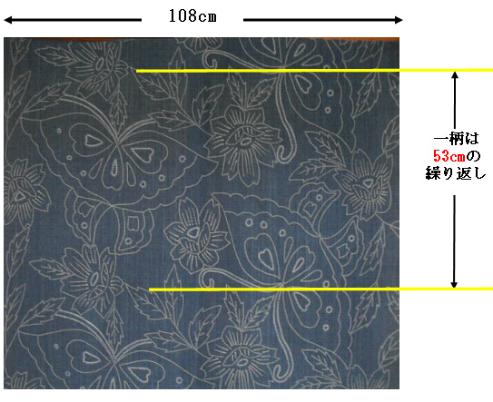 綿100%、108cm幅、一絵柄は53cm、 生地は薄手です。 |