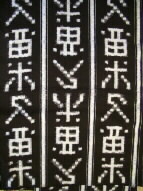 霰(あられ)柄の久留米絣をベースに文字絣を組み合わせました。