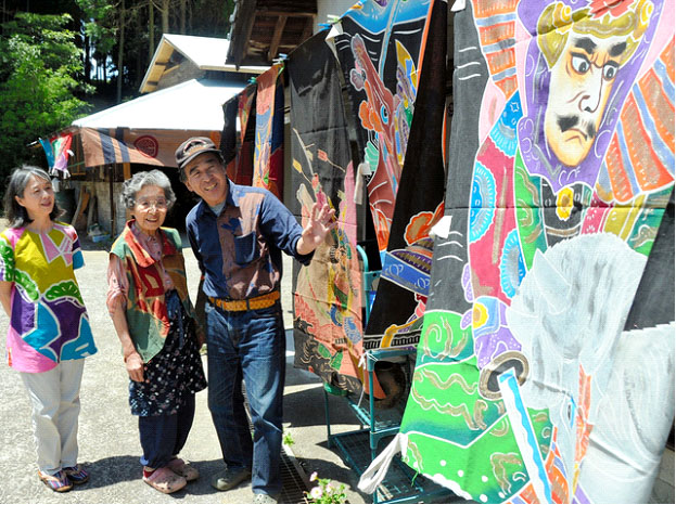 多くの芸術家が活動している村を「芸術の村」として印象づけようと2012年から始まった。 陶芸、ステンドグラス、絵画など個性豊かな芸術品が、古民家などに展示されている。 実行委員会の今村一秀さん(59)は江戸時代から続く実家を開放し、こいのぼりの横に立てる 幟旗(のぼりばた)や大漁旗の古きれで作った手芸品などを展示。 「今年は、元気でやっていますというところを見てもらいたい」と話す。 |